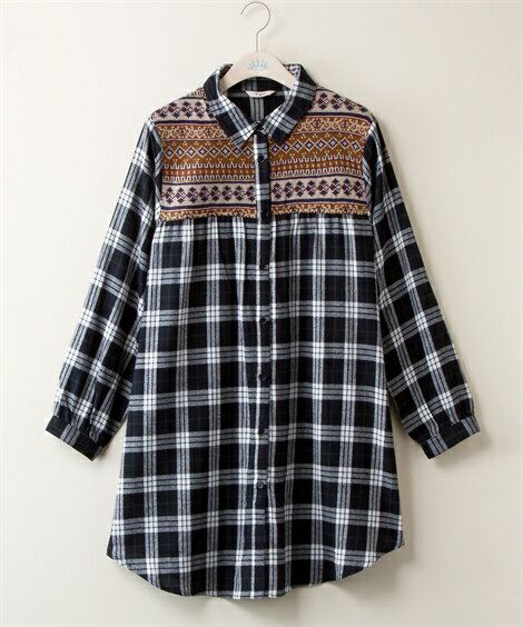 大きいサイズ レディース ニット 切替 ロング シャツ チュニック オレンジ系チェック/黒系チェック 4L ニッセン