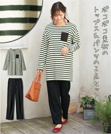 チュニック 大きいサイズ レディース 2点セット カットソー +9分丈 パンツ グリーン×オフホワイト+黒 L/LL/3L ニッセン